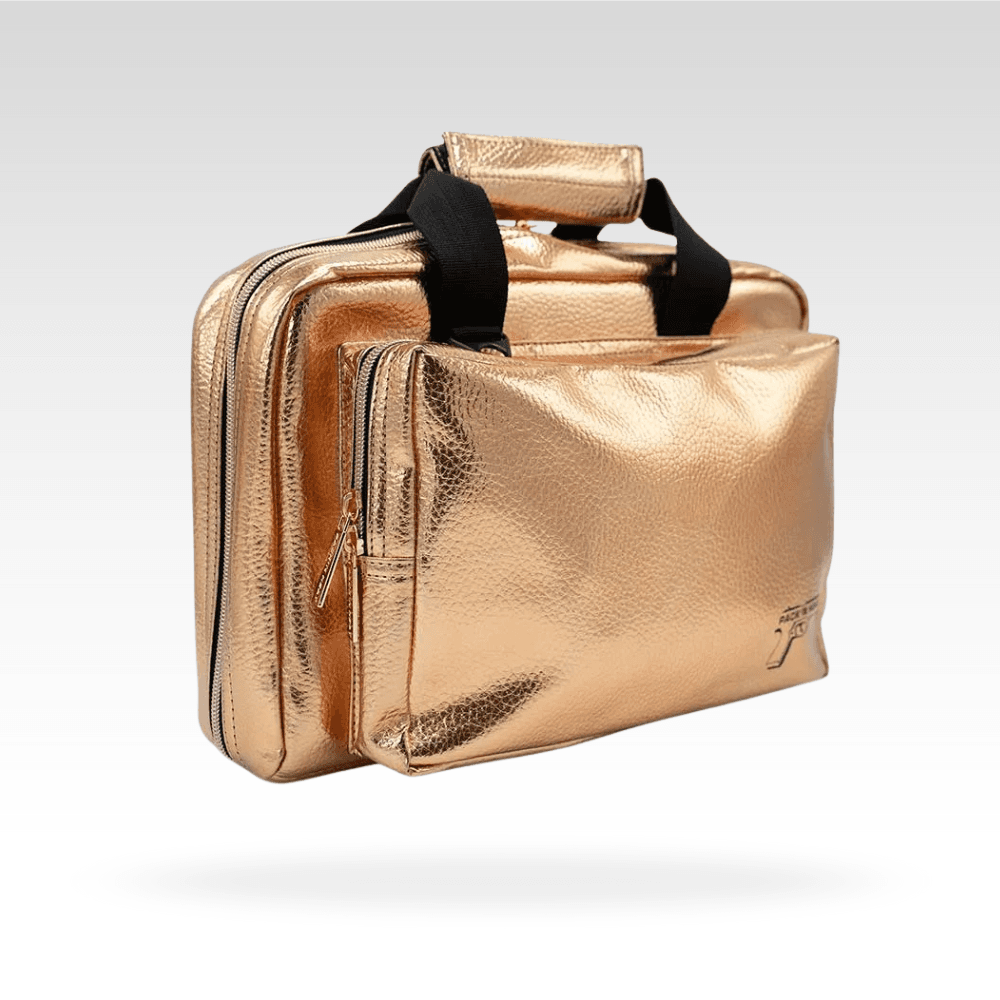The thoughtful design includes a front pocket (10″ x 7″ x 2″), two interior padded side pistol pockets (12″ x 8″) with a hook and loop tab for secure gun placement, and eight pistol magazine pockets (3″ x 5.5″). The brushed Tricot padded liner ensures added protection. The bag is completed with wrap-around handles, rose gold zippers, and an optional crossbody strap included with each bag. Elevate your range experience with this stylish and functional Crossbody Range Bag.